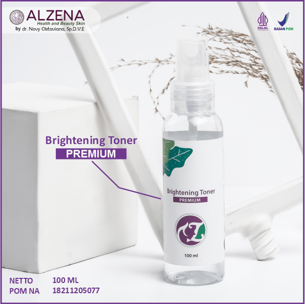 Brightening Toner Premium merupakan toner yang diformulasikan untuk jenis kulit normal namun aman juga digunakan untuk semua jenis kulit. Toner ini mampu membersihkan kulit wajah, menyegarkan kulit wajah, menyeimbangkan PH kulit wajah, menutrisi kulit, serta mencerahkan kulit wajah. Mengandung bahan aktif Hamamelis Virginiana Water dari AMERIKA yang kaya akan antioksidant sehingga mampu menangkal radikal bebas, mempunyai sifat anti-inflamatory yaitu mampu meredakan peradangan / rititasi pada kulit, mengurangi bakteri penyebab jerawat serta bertindak sebagai astrigen yang dapat mengecilkan pori-pori. Mengandung Aloe Barbadensis Leaf Extract yang kaya vitamin A, C, dan E untuk mencerahkan kulit wajah, membunuh bakteri penyebab jerawat, melembabkan kulit wajah, mengurangi minyak berlebih di wajah, meremajakan kulit wajah serta mempunyai sifat antibakteri dan antiinflamasi. Gunakan Brightening Toner Preminum secara rutin untuk mendapatkan kulit sehat, cerah, bebaskomedo dan jerawat.