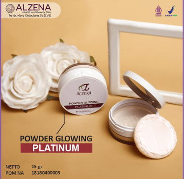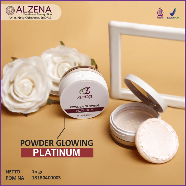 POWDER GLOWING PLATINUM merupakan powder yang diformulasikan secara khusus dari powder pilihan yang lembut dan ringan untuk memulas kulit wajah. Bedak ini dapat digunakan pada semua jenis kulit, yang mana dapat menjadikan kulit wajah tampak lebih cerah, menyamarkan bekas jerawat, menyamarkan pori-pori, menjadikan kulit wajah tampak lebih halus dan awet dipakai seharian. POWDER GLOWING PLATINUM mempunyai kandungan MICA (particle gliter) yang mempunyai efek glowing sehingga wajah terlihat menjadi glowing ketika memakai bedak. POWDER GLOWING PLATINUM juga mengandung bahan aktif Titanium Dioxide yang melindungi kulit dari sinar UV setelah diaplikasikan, dapat merawat kulit sensitif dan bersifat non comedogenic atau tidak menyebabkan komedo, namun untuk perlindungan maksimal tetap gunakan sunscreen sebelum penggunaan bedak.