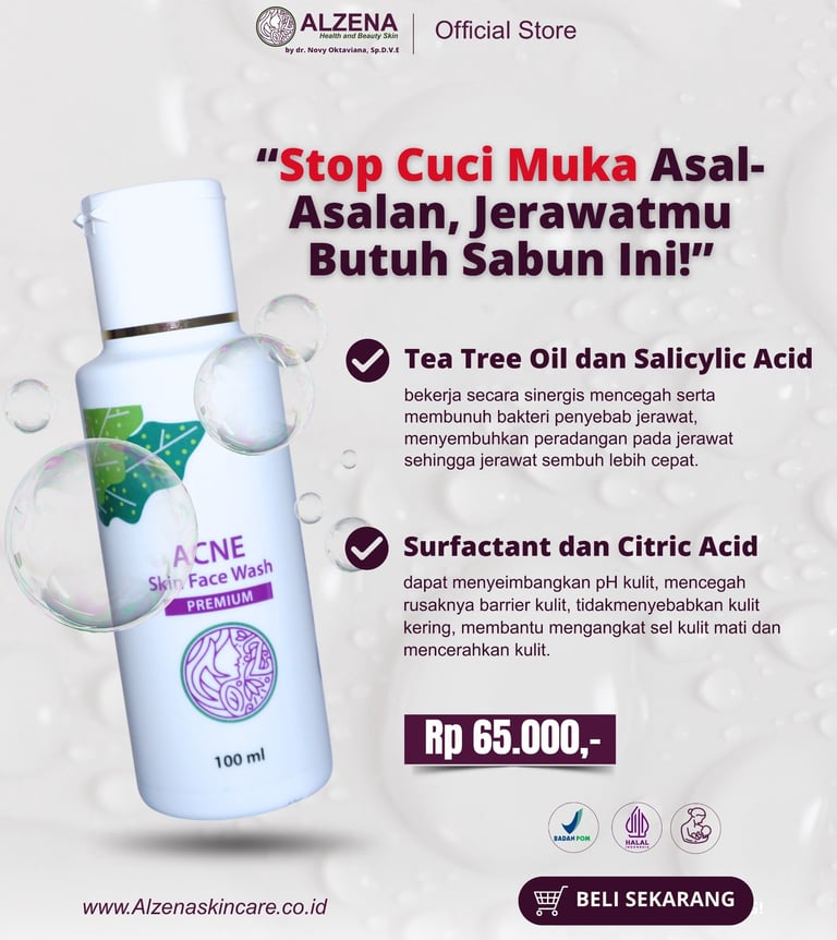 Untuk itu, Alzena Skincare menghadirkan solusi premium: Acne Skin Face Wash. Produk ini diracik khusus oleh dr. Novy Oktaviana, Sp.D.V.E untuk memastikan keamanan dan efektivitasnya bagi kulit pejuang jerawat.